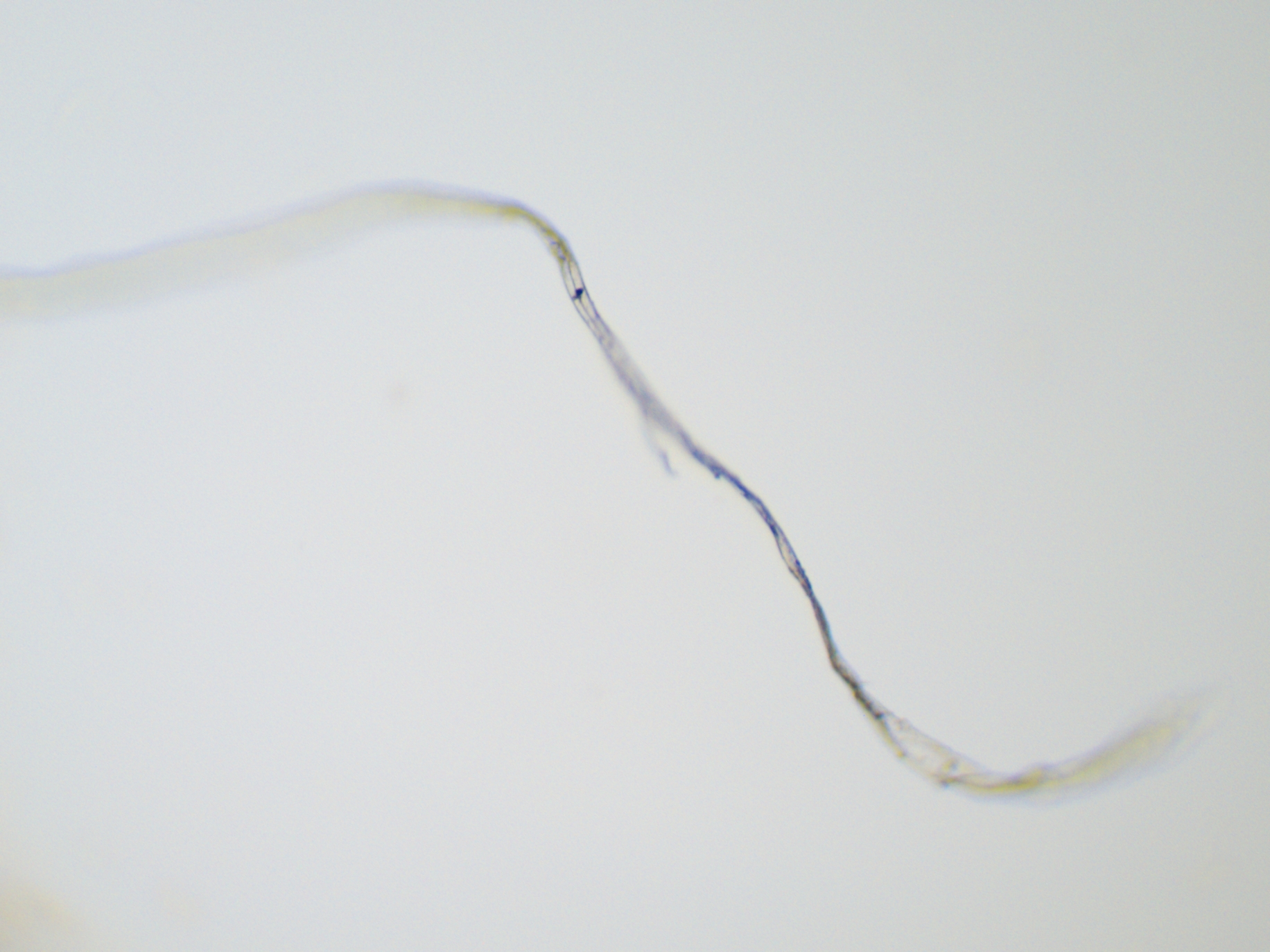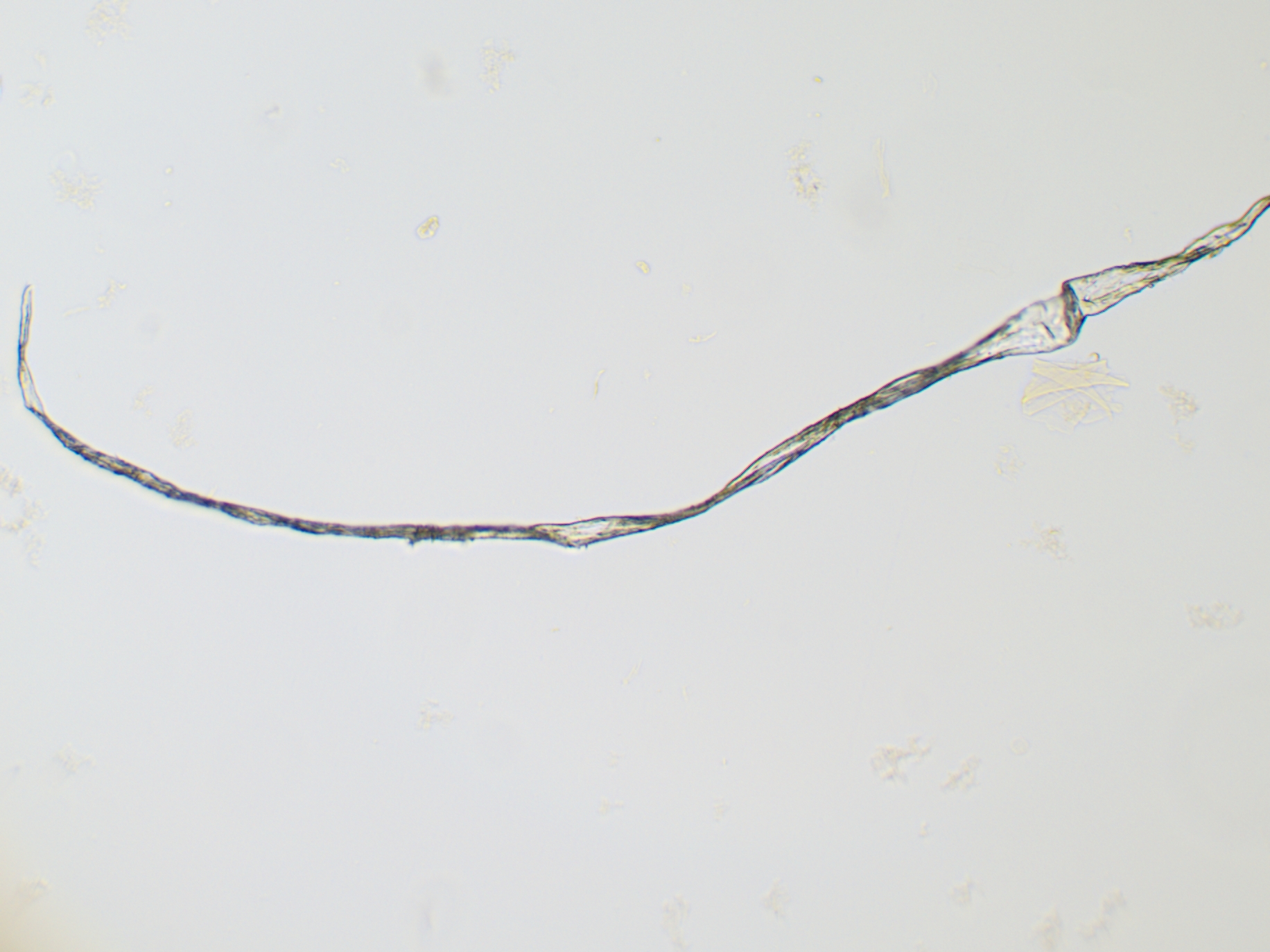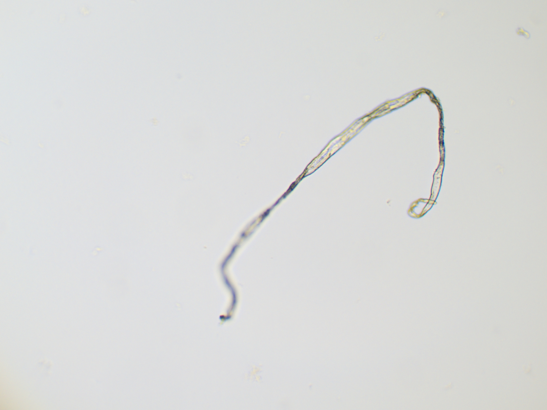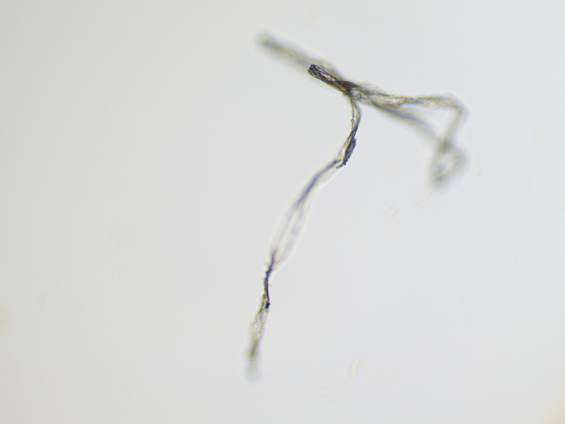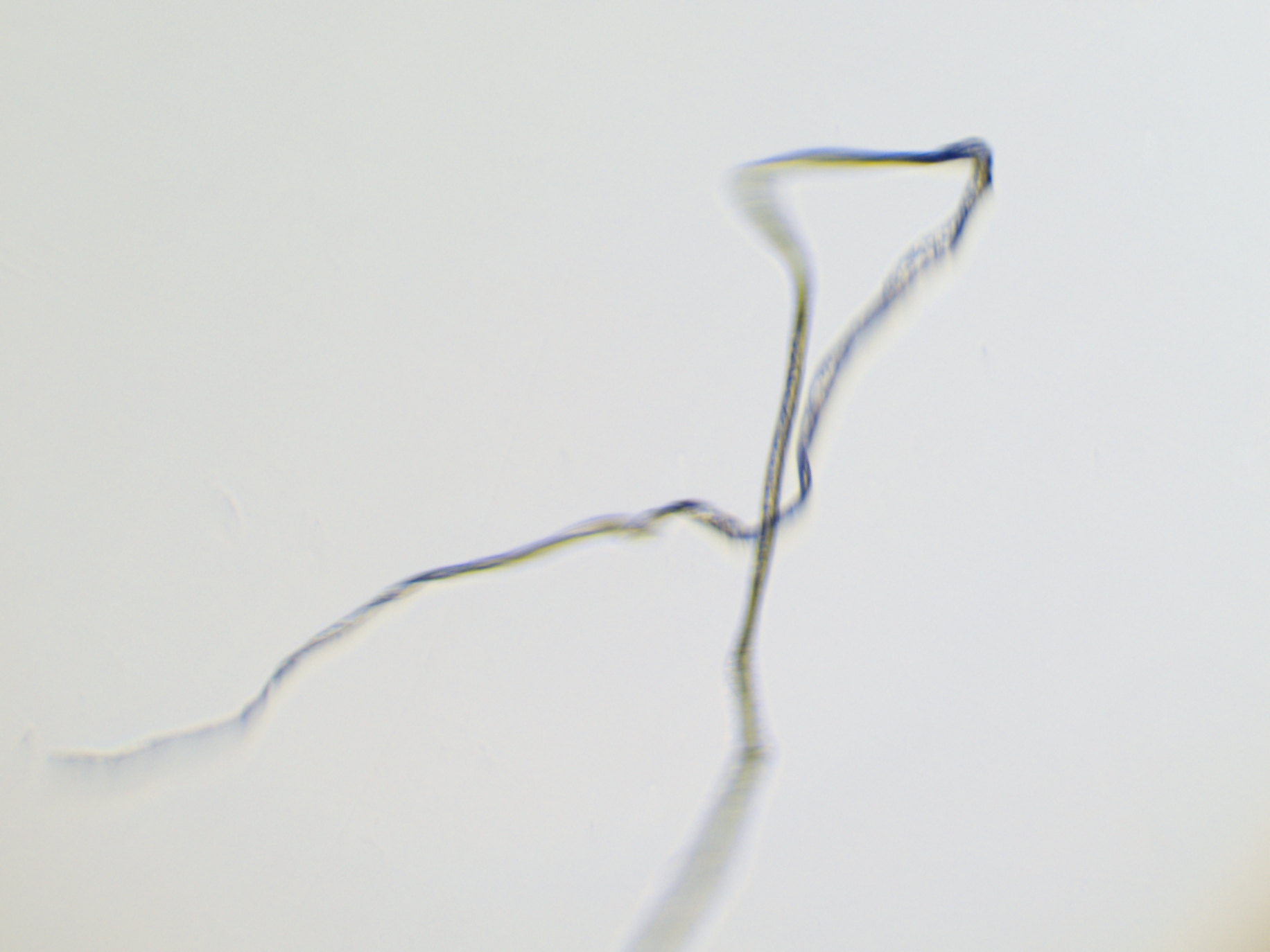 スライドショーのこの非常に長いフィラメントはくねくねした状態で上から下までの幅が約14mm もあり、肉眼でも確認できる。シャーレの直径は35mm。もし、このフィラメントを直線に伸ばしたら、ゆうにシャーレの半径は超えるだろう。ちなみに顕微鏡では40倍で探して100倍で詳細を観察するというのがわたしのパターンだが、対象によっては今回のように肉眼での観察が適切な場合もある。