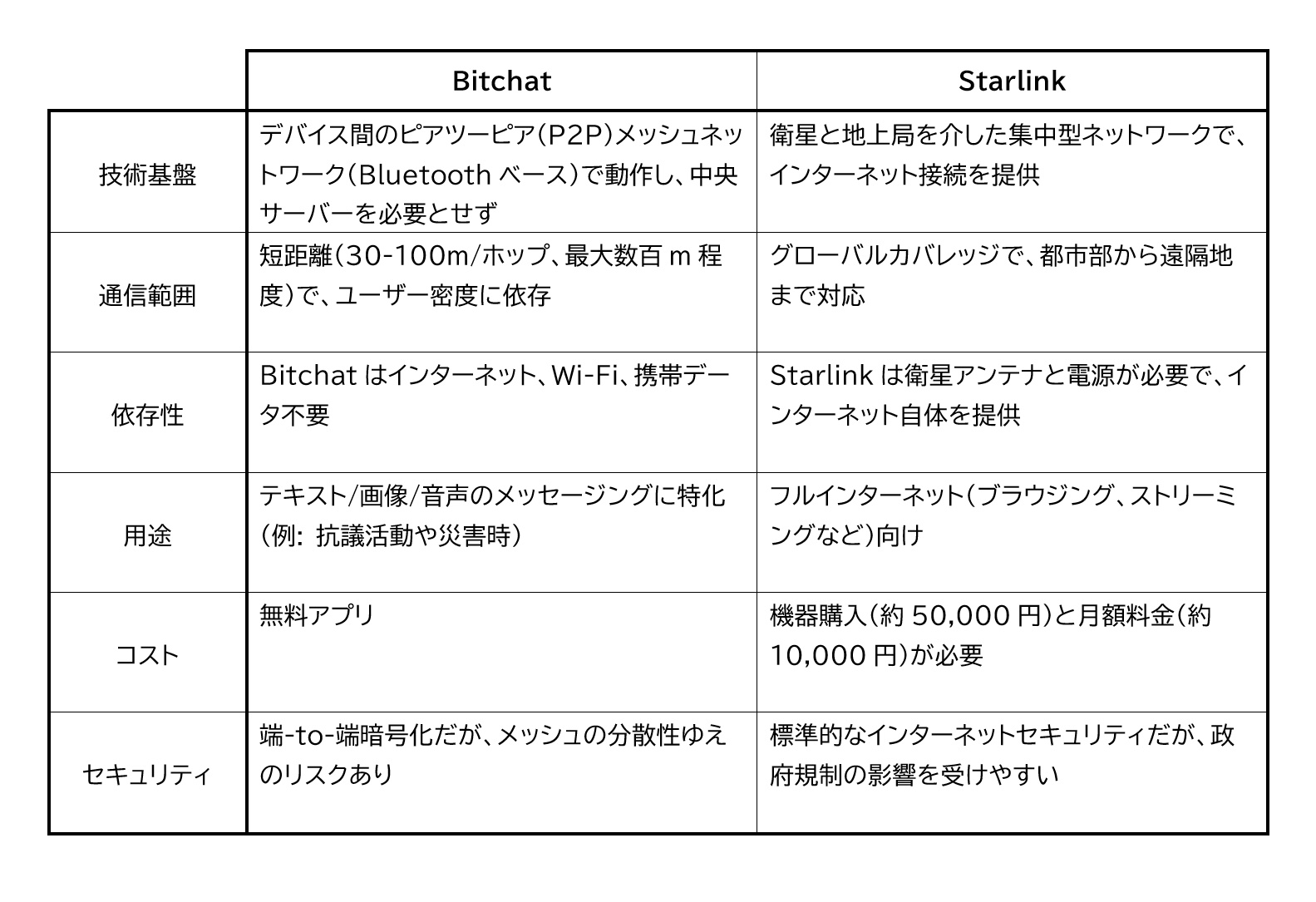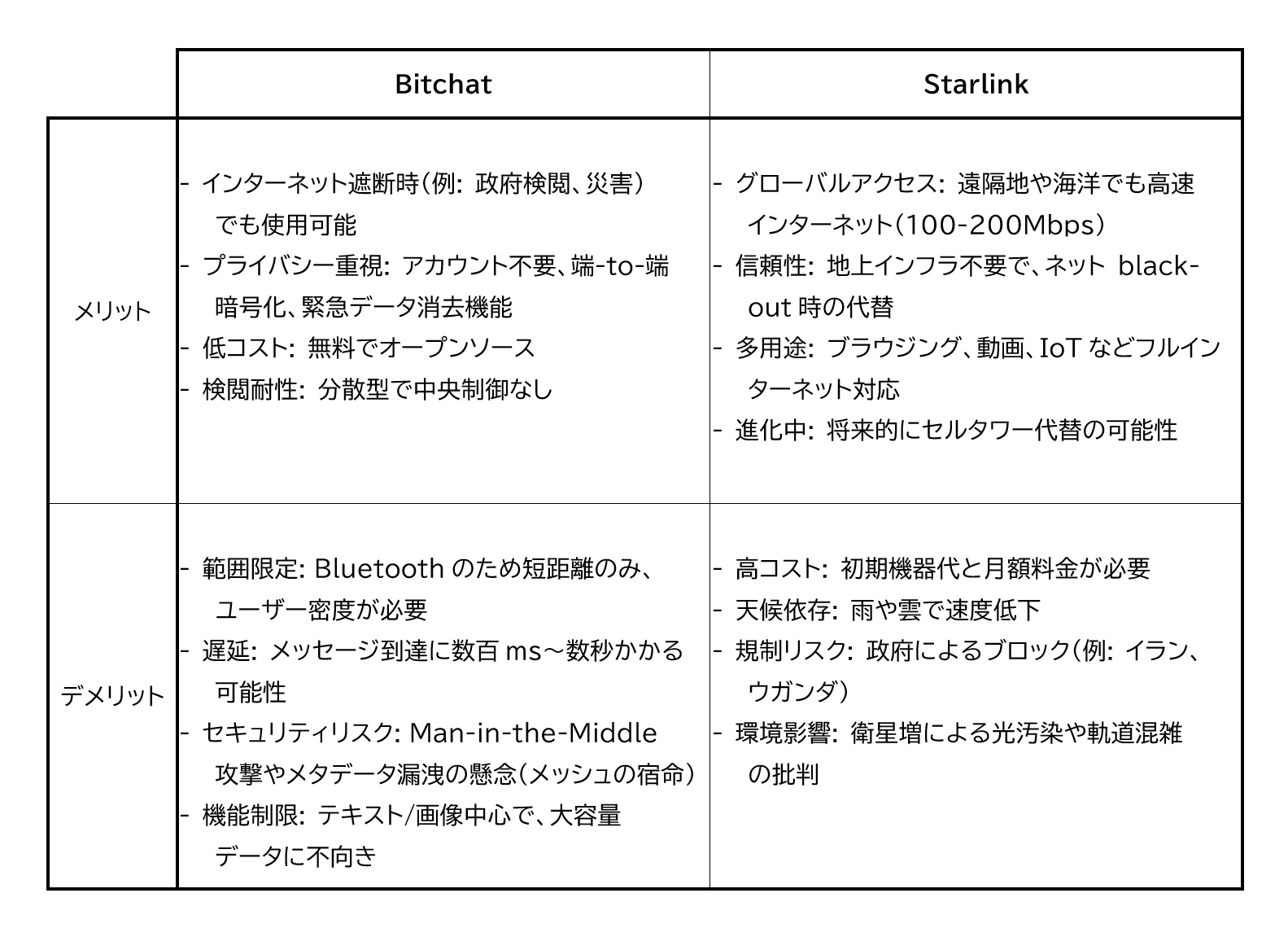 ページ最後に Bitchat vs Starlink の比較一覧表