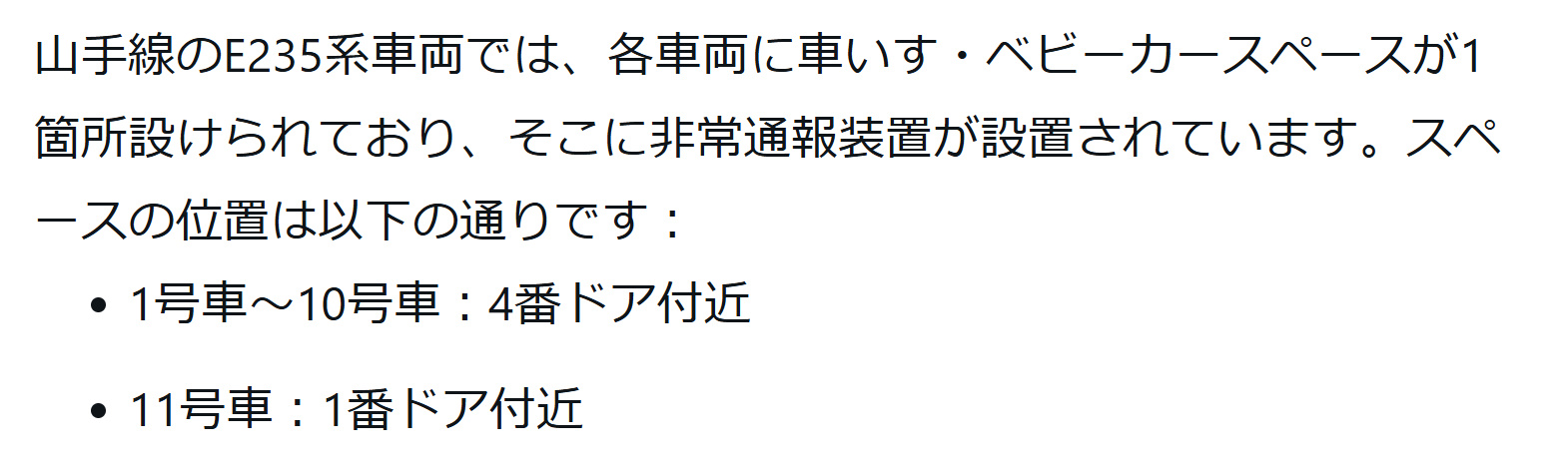 3)場所の詳細:内回りの4本の電車のそれぞれ9号車4番ドア横の「非常通報装置」の上。