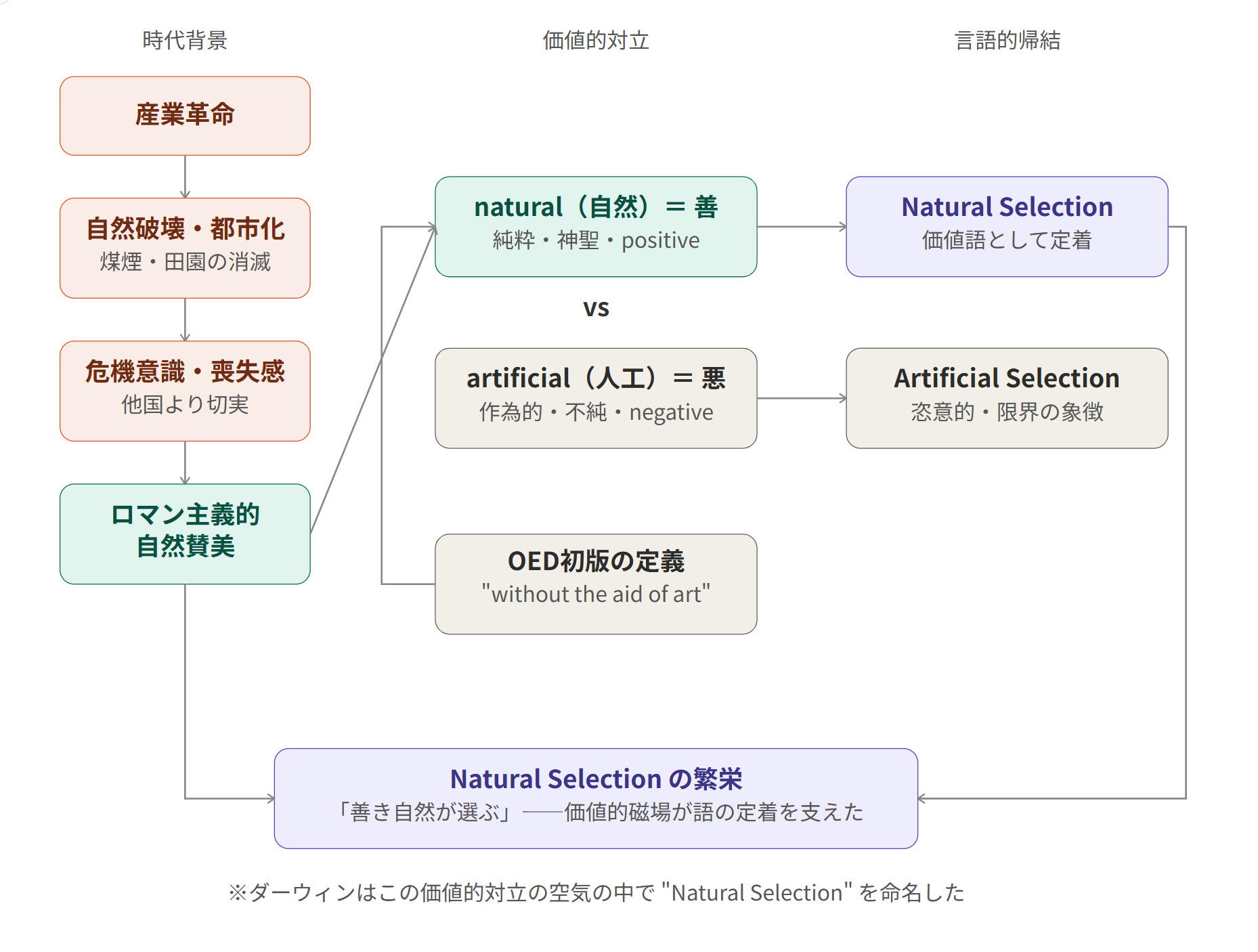 ここで一つの問いを立てておく。もしダーウィンがフランス人だったら、あるいは日本人だったら、Natural Selection という語は生まれていただろうか。英語の無生物主語構文が Nature selects という文を自然に生成するように、ロマン主義的自然観が “Natural” という形容詞に善の威光を授けるように——この語の誕生と繁栄は、19世紀ヴィクトリア朝英国という特定の言語・文化的磁場の産物だったのだ。”Natural” は最初から中立的な科学用語ではなかった。それは、産業革命への反動として醸成されたロマン主義的自然観を背負って、進化論の語彙に紛れ込んだのである。