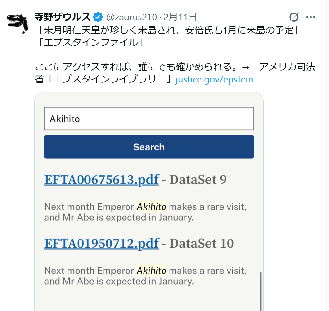 まあ、ビル・クリントン元米大統領はいわずもがな、英国王室のアンドリュー王子もエプスタイン島のリピーターとして広く知られている。日本の皇室も英国王室並みということか? ![]()